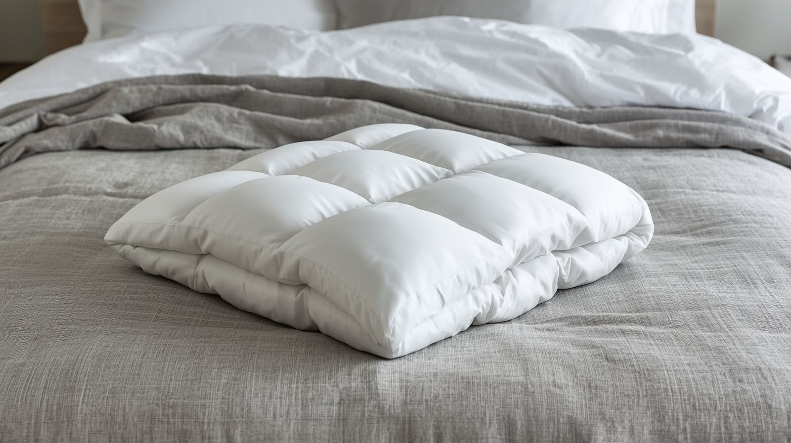- Top: Your Duvet, folded in thirds or halves at the foot of the bed.