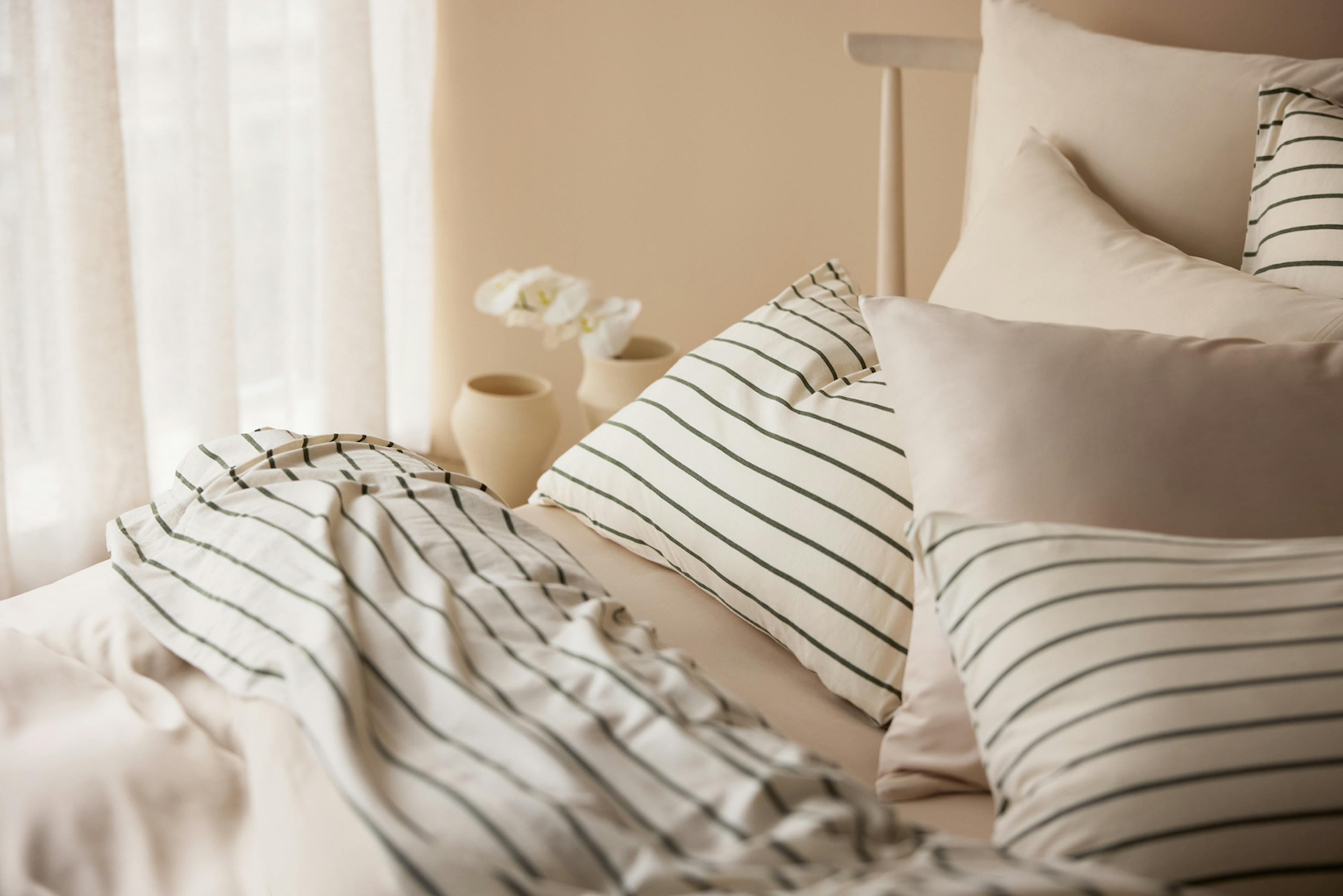 Light, breathable fabrics like Pure Linen and Fresh Cotton Percale help regulate temperature as the weather shifts. And layered colours and patterns help create a bed that feels inviting - not just to sleep in, but to live in.